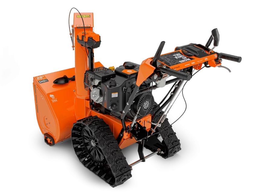 Ez a Deluxe 28 Rapid Track változat olyan kétfázisú (two-stage) hómaró, mely hevedertalpas („track”) meghajtással rendelkezik — tehát kiváló választás havas, jeges, vagy nehezebb terepen való használatra, ahol a stabil tapadás kritikus.