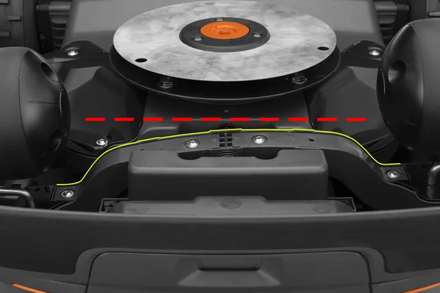 A fűnyíró tetején található három megemelt terület lehetővé teszi, hogy a karbantartás során stabilan, fejjel lefelé fordítva tárolható anélkül, hogy karcolást vagy károsodást okozna a házban.