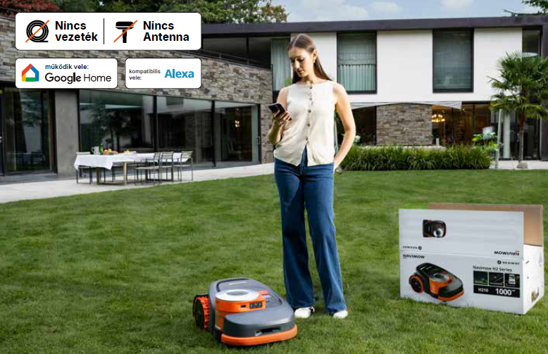 Csak bontsa ki a dobozt, csatlakoztassa, nyomja meg a „Start” gombot, és a fűnyíró azonnal munkához lát. Önnek több ideje és szabadideje marad, miközben a gyep tökéletesen ápolt lesz – minden fáradság nélkül. Hangvezérlés Alexa és Google Home segítségével. A kertápolás soha nem volt ilyen egyszerű!