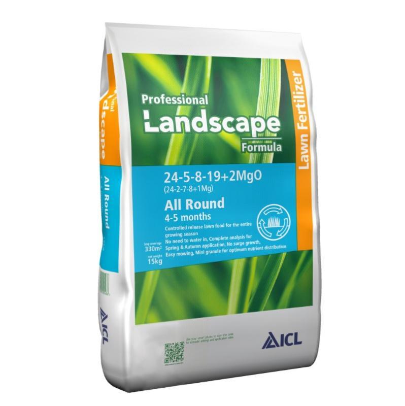 Az ICL Landscaper Pro All Round közepes hatástartamú, bármilyen kerti gyepfelületen használható gyepműtárgya a tavaszi műtrágyázás közötti időszakra. Egyedülálló burkolatának köszönhetően, tartós tápanyagforrást biztosít a gyep számára. Jól kiegészíthető a Mohásodás csökkentő (Shade Special) és Gyomirtós (Weed Control) gyepműtrágyákkal. Az üde zöld gyepszín érdekében magnéziumot is tartalmaz. Bármilyen kertépítői programba beilleszthető.