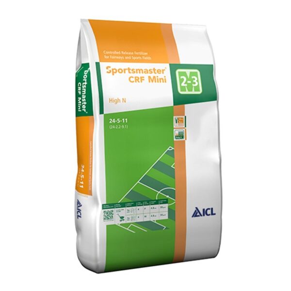 A Sportmaster CRF Mini High N olyan összetett műtrágya, amelynek tápanyag leadása szabályozott, burkolt és hagyományos, burkolat nélküli műtrágyaszemcsék keveréke az egyenletes fejlődés érdekében lett kialakítva. A burkolat nélküli szemcsék azonnal felvehető tápanyagot biztosítanak a gyep számára. Tökéletes választás szezon elején első szabályozott leadású műtrágyaként való alkalmazásra. Hűvös időben is gyors választ garantáló technológia. Segíti az egészséges, kiegyensúlyozott növekedést a szezon elején. Kisebb mini szemcséknek köszönhetően kiszóráskor jobb fedést lehet elérni négyzetméterenként. Így érhető el a sűrűség növelése. Magas hatóanyag tartalomnak köszönhetően alacsony az alkalmazási dózisa és ezzel sokkal költséghatékonyabb technológia.